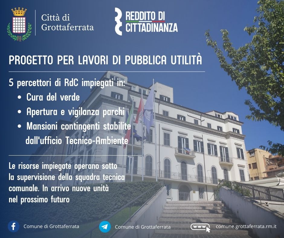 “Lavoriamo per una Grottaferrata sempre più solidale, che sia in grado di coniugare l’inclusione sociale alla creazione di valore pubblico – dichiara il Sindaco Mirko Di Bernardo –. Siamo lieti di poter fornire ai beneficiari del RdC un’occasione per ripartire e allo stesso tempo per crescere professionalmente, attraverso un progetto orientato alla cura dei beni pubblici e del verde cittadino. Ringrazio il Dirigente del Settore Tecnico-Ambiente Andrea Trinca e tutti gli uffici coinvolti nel progetto”.