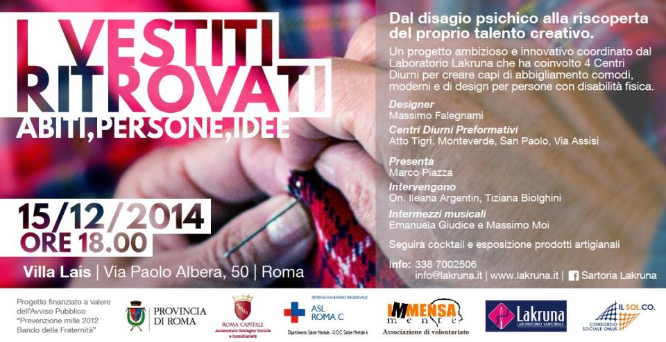 Lunedì 15 dicembre 2014 ore 18,00 negli spazi di Villa Lais la serata-evento in cui saranno presentati i prodotti, i gruppi di lavoro e i professionisti che hanno contribuito al progetto I VESTITI RITROVATI dedicato alla creazione di abiti, studiati e reinventati per risultare vestibili, piacevoli e adatti alle esigenze fisiche e personali di ogni individuo.
