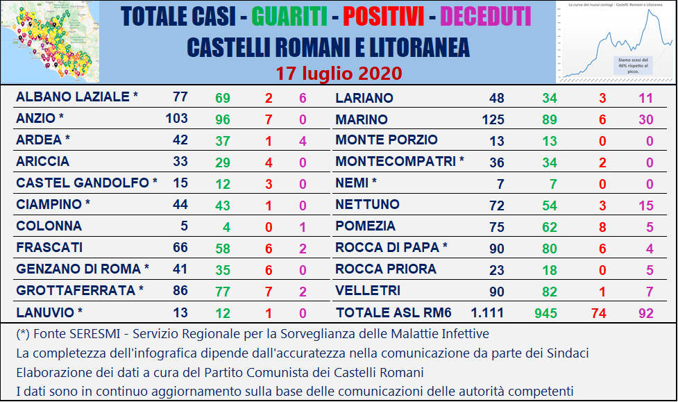 Nella tabella seguente viene riportata la ripartizione dei contagi per singolo comune dei Castelli Romani e della Litoranea sulla base delle comunicazioni ufficiali delle autorità competenti.