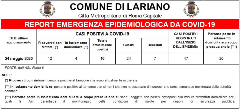 dai dati estratti dalla piattaforma online della Asl Roma 6, la situazione dei contagi e degli isolamenti domiciliari registrati sul nostro territorio fino ad oggi, 24 maggio 2020, risulta la seguente: