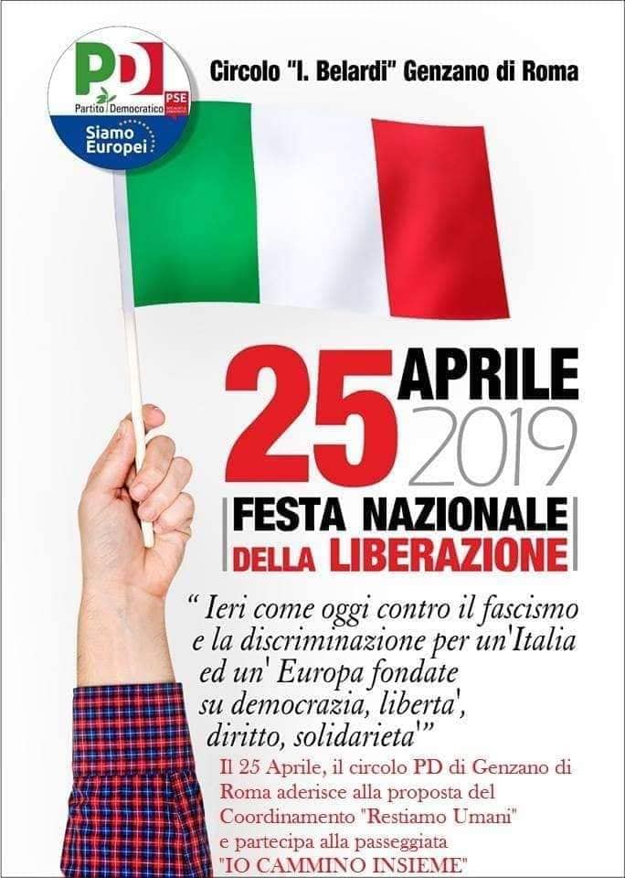 “Il Circolo del Partito Democratico di Genzano il 25 Aprile parteciperà all’iniziativa del Coordinamento Restiamo Umani Castelli Romani dal titolo Io Cammino Insieme. La passeggiata che prenderà il via da Genzano e attraverserà i Comuni di Ariccia ed Albano, per concludersi a Castel Gandolfo, vuole promuovere i diritti umani, un’Italia libera dai nazionalismi, un’Europa unita ed uno stile di vita ecosostenibile. Condividendo lo spirito della passeggiata, a carattere apartitico ed a cui hanno aderito già decine di realtà del territorio, la riteniamo un utile momento di riflessione sulle ragioni profonde per cui celebriamo il 25 Aprile la festa della liberazione dal nazifascismo. Quando oggi infatti, il Vice Presidente del Consiglio e Ministro degli Interni Salvini dichiara di considerare questa data come un “derby tra fascisti e comunisti”, annunciando di non partecipare alle cerimonie istituzionali, noi pensiamo che si debba manifestare plasticamente e fisicamente quanto i valori della libertà e dell’antifascismo sanciti sulla Costituzione su cui anche lui ha giurato, non siano questioni da museo ma oggetto di vita quotidiana anche oggi, che interessano il futuro dell’Italia e dell’Europa”. Così in una nota il Circolo del Partito Democratico di