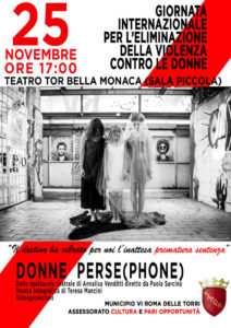Il video, tratto dallo spettacolo teatrale Donne Perse(Phone) scritto da Annalisa Venditti e diretto da Paola Sarcina, è stato realizzato dagli studenti del liceo di Rodi Garganico e verrà proiettato giovedì 25 novembre, alle ore 17:00, presso la sala piccola del Teatro di Tor Bella Monaca. Donne Perse(Phone) è un gruppo al femminile che racconta le storie di violenze di donne vittime di uomini violenti, spesso umiliate e uccise dai loro compagni; alcuni passi del testo, recitati da dodici studentesse della scuola media Donatello, accompagneranno l’inaugurazione della mostra fotografica di Teresa Mancini, ispirata allo spettacolo, e la proiezione del trailer del Docufilm che racconta le varie tappe di questo progetto multidisciplinare contro la violenza di genere.