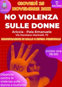 Domani, 25 novembre, si celebra la Giornata Internazionale contro la Violenza sulle Donne, numerose sono le iniziative di sensibilizzazione sul tema. Per l’occasione, ad Ariccia, l’Amministrazione comunale, con la collaborazione dell’Associazione “KO al bullismo” ha organizzato una serata di dibattito e inclusione all’interno della struttura del “Pala Emanuele”. L’evento si articola in due parti, la prima con un dibattito contro la violenza sulle donne e il bullismo al quale parteciperanno tra gli altri il Sindaco Gianluca Staccoli e Danilo Costantini Consigliere Comunale delegato allo Sport; mentre nella seconda parte della serata sono previste delle esibizioni di diversi sport femminili curati dalla società sportive del territorio.