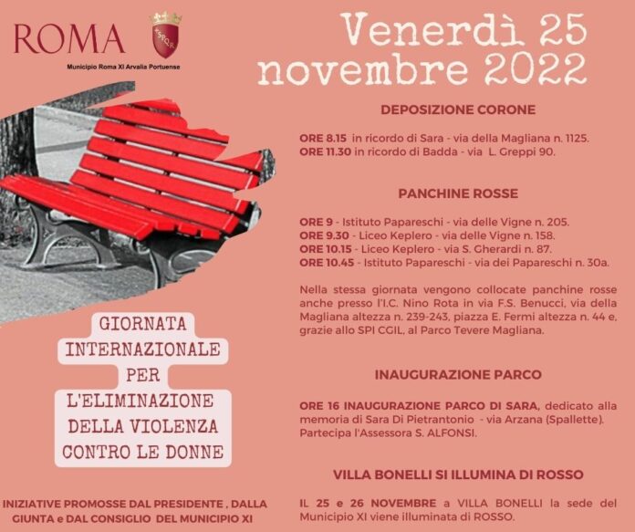 il 25 novembre si celebra la Giornata internazionale per l’eliminazione della violenza contro le donne che ha l’obiettivo di sensibilizzare e portare all’attenzione dei cittadini il dramma della violenza e la tragedia dei femminicidi. Di seguito le principali iniziative che arricchiranno il programma della giornata nel Municipio Roma XI:
