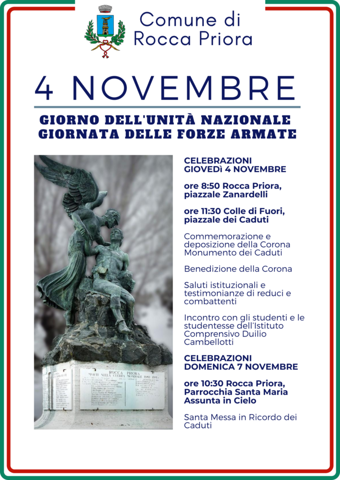 La cerimonia si terrà ai Monumenti ai Caduti di Rocca Priora, alle ore 8:30, e Colle di Fuori alle ore 11.30, e vi parteciperanno la Sindaca Anna Gentili, gli Assessori, i Consiglieri, l’Associazione Reduci e Combattenti, le classi dell’ I.C. Duilio Cambellotti – Rocca Priora e le Associazioni del territorio.
