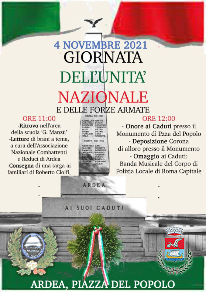 Alle ore 11.00, nell’area della scuola “Manzù”, saranno proposte delle letture di brani a tema, curate dall’Associazione “Combattenti e Reduci” di Ardea; a seguire, è in programma la consegna di una targa-ricordo ai familiari di Roberto Ciolfi, già Presidente dell’Associazione “Combattenti e Reduci” e punto di riferimento della comunità cittadina, recentemente scomparso. Alle ore 12.00, poi, le Autorità Civili, Militari e Religiose onoreranno i Caduti davanti al Monumento di piazza del Popolo, con la deposizione di una corona d’alloro. Le celebrazioni si concluderanno con l’esibizione della Banda Musicale del Corpo di Polizia Locale di Roma Capitale.