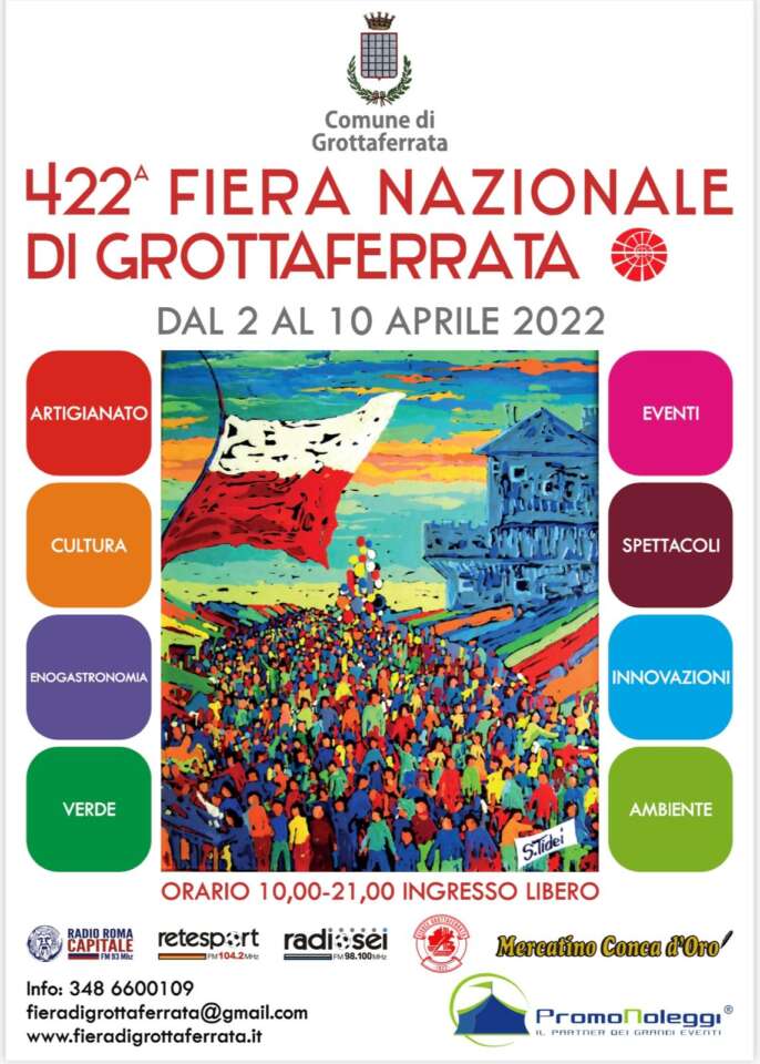Nello splendido borgo di Grottaferrata, nel cuore dei Castelli Romani, torna quest’anno la 422° Fiera di Grottaferrata, dal 2 al 10 aprile 2022, un evento tipico della tradizione che si svolge da più di quattrocento anni. Nove giorni di eventi e di attività per rendere omaggio alla tradizione dei prodotti dell’eccellenza italiana e alla promozione della cultura e dell’innovazione “Green”.