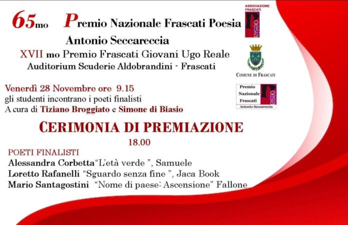 Frascati Poesia alle ore 9.15, gli studenti incontrano i poeti finalisti, Alessandra Corbetta, Mario Santagostini, Loretto Rafanelli. A cura di Tiziano Broggiato, Simone di Biasio e Rita Seccareccia. Alle ore 18.00, Cerimonia di premiazione che decreterà il 65° vincitore del Premio Nazionale Frascati Poesia Antonio Seccareccia e i vincitori della XVII ed. del Premio Frascati Giovani Ugo Reale. Il Premio Frascati Poesia, ha attraversato, nella sua lunga storia, il meglio della poesia italiana: da Alfonso Gatto ad Alberto Bevilacqua, da Diego Valeri ad Attilio Bertolucci, da Andrea Zanzotto a Valerio Magrelli, Milo De Angelis, Silvia Bre, Davide Rondoni e in ultimo Gian Mario Villalta. E oggi, continua ad essere il cuore di un territorio italiano che si sente leader e di eccellenza, per la sua grande storia ed il suo sguardo turistico – culturale di prospettiva internazionale. Perché la poesia è un arte, e come tutte le arti è bellezza.