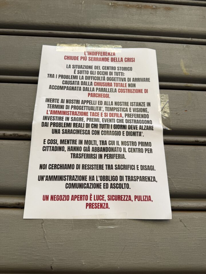 Questo, però, in questa manifestazione goliardica, si è inserita una protesta silenziosa e pacifica fatta da volantini affissi un po’ ovunque lungo il centro storico e non solo, da anonimi cittadini, che però hanno voluto esternare il proprio sdegno verso il malfunzionamento della città. Infatti, come si può leggere sulle locandine, viene criticata la mancanza di posti auto a causa di piazza Cairoli completamente pedonale a seguito dei lavori di ristrutturazione e del guasto della scala mobile ormai da diversi giorni che non permette a chi ne avrebbe bisogno di usufruirla, causando chiusure e disservizi tra i lavoratori.