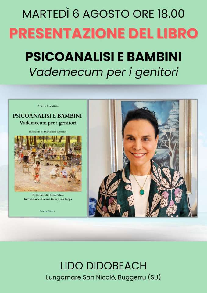 Martedì 6 agosto, alle 18, al Lido Didobeach (Lungomare San Nicolò) di Buggerru (Sud Sardegna), si terrà la presentazione di “Psicoanalisi e Bambini – Vademecum per i genitori”, il nuovo libro di Adelia Lucattini, Psichiatra e Psicoanalista, Ordinario della Società Psicoanalitica Italiana. L’opera, edita da Carena Editore, è disponibile in libreria su ordinazione e nei principali store on line.