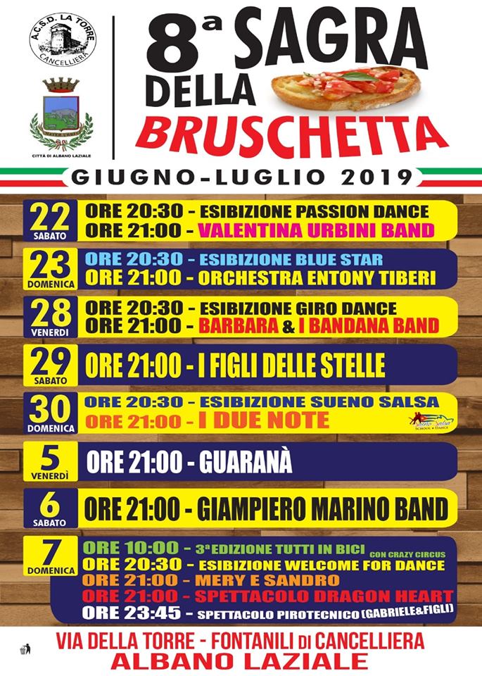 Sabato 22 giugno, alle ore 20.30, al via l’ottava edizione della Sagra della Bruschetta presso gli storici Fontanili di Cancelliera in Via della Torre (Albano Laziale). La manifestazione, a cura dell’ACSD La Torre, si aprirà con l’esibizione di Passion Dance e a seguire con la Valentina Urbini Band. Si bisserà domenica 23 giugno alle ore 20.30 con Blue Stare alle 21 con l’Orchestra Entony Tiberi. Il weekend successivo si aprirà venerdì 28 giugno alle ore 20.30 con l’esibizione Giro Dance, dopodiché con Barbara & I Bandana Band. Sabato 29 sarà la volta alle 21 de I Figli delle Stelle. Il weekend si chiuderà domenica 30 alle 20.30 con l’esibizione della Sueno Salsa School Dance e alle 21 con quella de I Due Note. La tre giorni conclusiva della Sagra della Bruschetta comincerà venerdì 5 luglio alle 21 con i Guaranà. Sabato 6 luglio spazio dalle 21 alla Giampiero Marino Band. La giornata conclusiva, domenica 7 luglio, inizierà alle 10 con la terza edizione di Tutti in Bici con Crazy Circus. Alle 20.30 si terrà l’esibizione di Welcome For Dance. A seguire Mary e Sandro e lo spettacolo Dragon Heart. Gran chiusura con lo spettacolo pirotecnico della ditta Gabriele & Figli.