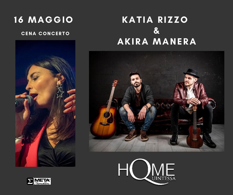 Venerdì 16 maggio è in calendario un nuovo appuntamento musicale, elegante e coinvolgente. Protagonista della serata saranno gli Akira Manera, il talentuoso duo accompagnato dalla meravigliosa voce di Katia Rizzo, che guiderà il pubblico in un emozionante viaggio tra le più belle canzoni italiane e internazionali. Il tutto nella raffinata cornice di La Quintessa Home, con la formula della cena-concerto per una serata da vivere e ricordare.