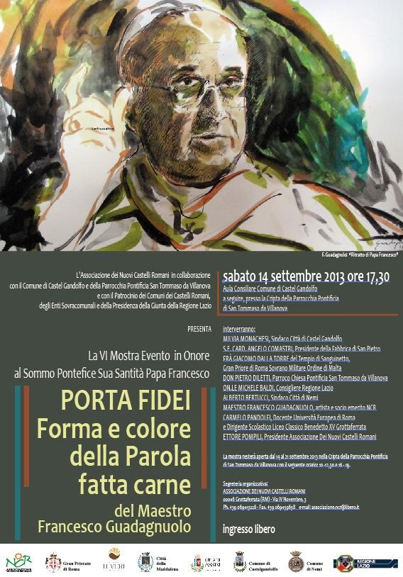 Sabato 14 settembre, alle ore 17,30, l’Associazione dei Nuovi Castelli Romani, in collaborazione con il Comune di Castel Gandolfo, della Parrocchia Pontificia San Tommaso da Villanova e con il Patrocinio dei Comuni dei Castelli Romani, degli Enti Sovracomunali e della Presidenza della Giunta della Regione Lazio, presenta la sesta Mostra Evento “PORTA FIDEI – Forma e colore della Parola fatta carne”, del Maestro Francesco Guadagnuolo in onore del Papa Francesco. L’Evento si svolgerà dapprima presso l’Aula Consiliare del Comune di Castel Gandolfo.