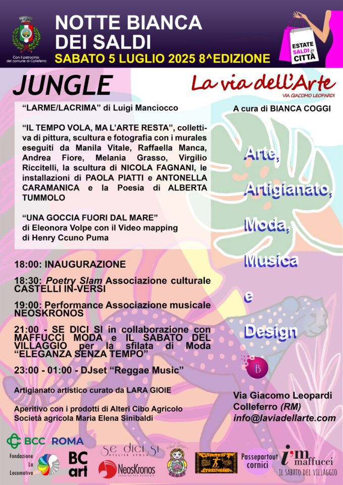 Dopo il successo delle precedenti edizioni, torna Sabato 5 luglio in via Giacomo Leopardi, a Colleferro, l’evento “Jungle” a cura di Bianca Coggi, organizzato dall’associazione “La via dell’Arte” APS.