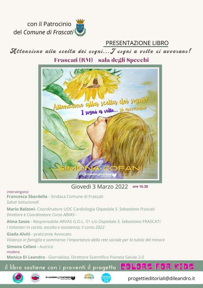 Il libro Attenzione alla scelta dei sogni! I sogni a volte… si avverano, sostiene il progetto COLORS FOR KIDS, per il contrasto alla violenza verso i minori, partito proprio dalla cittadina dei Castelli Romani, in collaborazione con Associazione Aurora OdV, Pianeta Salute 2.0 e con la partnership di Retenews 2.0.
