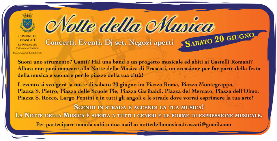 La Notte della Musica coinvolgerà non solo il tessuto economico ma l’intera cittadinanza che sarà invitata a farsi parte attiva della Festa, proponendosi con la propria chitarra o con un sax in strada e suonando e condividendo la propria musica con i passanti. Ovviamente saranno invitate anche le band più strutturate e le giovani e numerose band del territorio, a cui per altro è rivolto uno speciale call, per averle ospiti a Frascati.