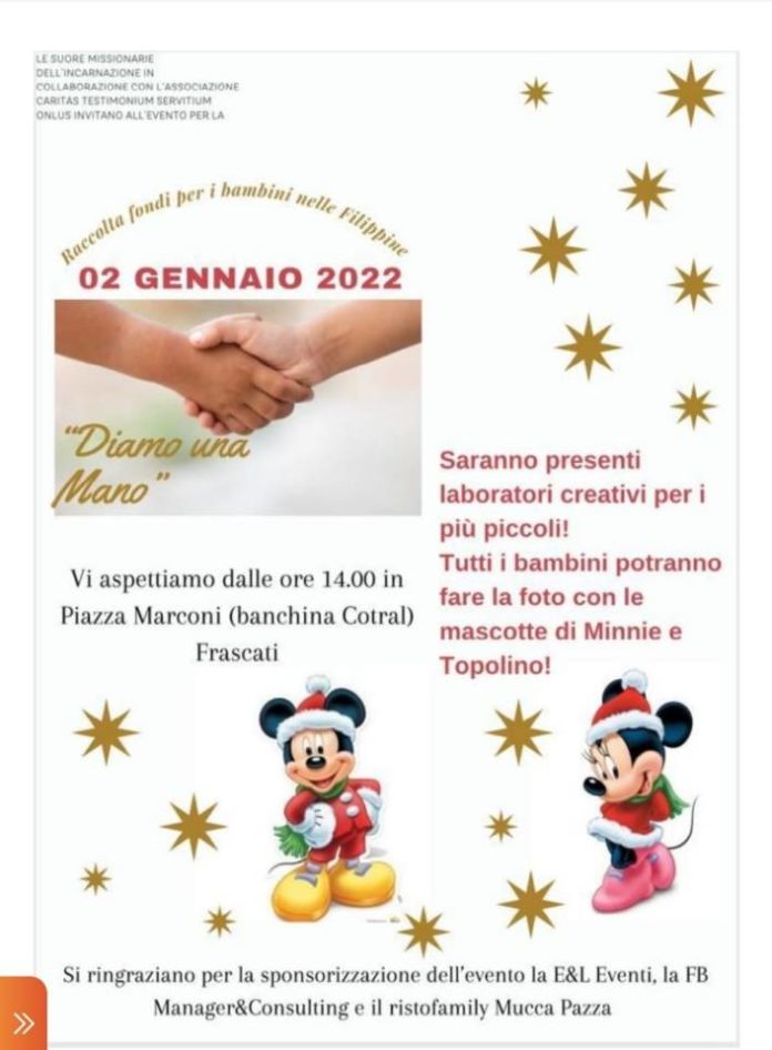 L’Associazione Caritas Testimonium Servitium Onlus e le Suore Missionarie dell’Incarnazione (SMI) vi invitano all’evento “Diamo una Mano”, che si terrà il 2 gennaio a Frascati, presso Piazza Marconi (banchina Cotral – dalle ore 14:00). Saranno presenti laboratori creativi dedicati ai bambini, che potranno anche fare una foto con le mascotte di Minnie e Topolino. L’ Onlus sostiene attivamente le SMI presenti in Italia, Costa D’Avorio, India, Albania, Vietnam e Filippine. Proprio nelle Filippine, l’orfanotrofio delle SMI è stato colpito negli ultimi giorni dal devastante tifone Rai: è per questo motivo che nasce l’evento “Diamo una Mano”, per recuperare fondi utili a ricostruire ciò che è stato danneggiato.