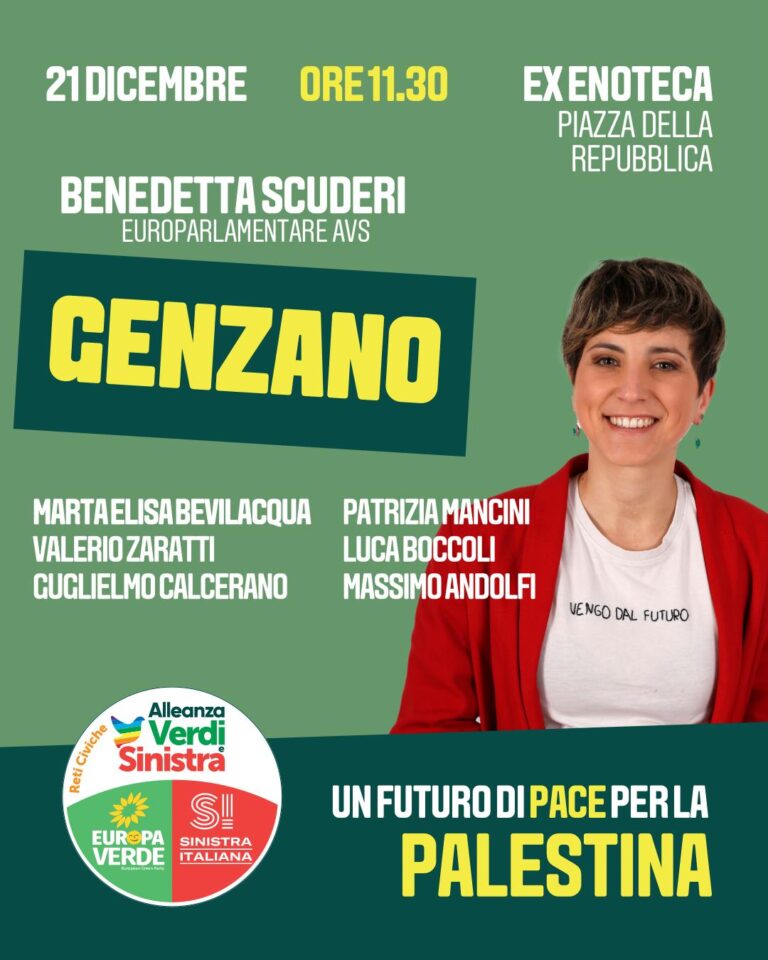 L’incontro vedrà la partecipazione dell’Europarlamentare AVS Benedetta Scuderi che ha fatto parte della Global Sumud Flottilla, delle Consigliere del gruppo AVS-Genzano Possibile Marta Elisa Bevilacqua e Patrizia Mancini, del co-portavoce provinciale di Europa Verde Valerio Zaratti, del co-portavoce regionale di Europa Verde Guglielmo Calcerano, del responsabile regionale alla comunicazione di Europa Verde Massimo Andolfi e del co-portavoce nazionale dei Giovani Europeisti Verdi, Luca Boccoli.