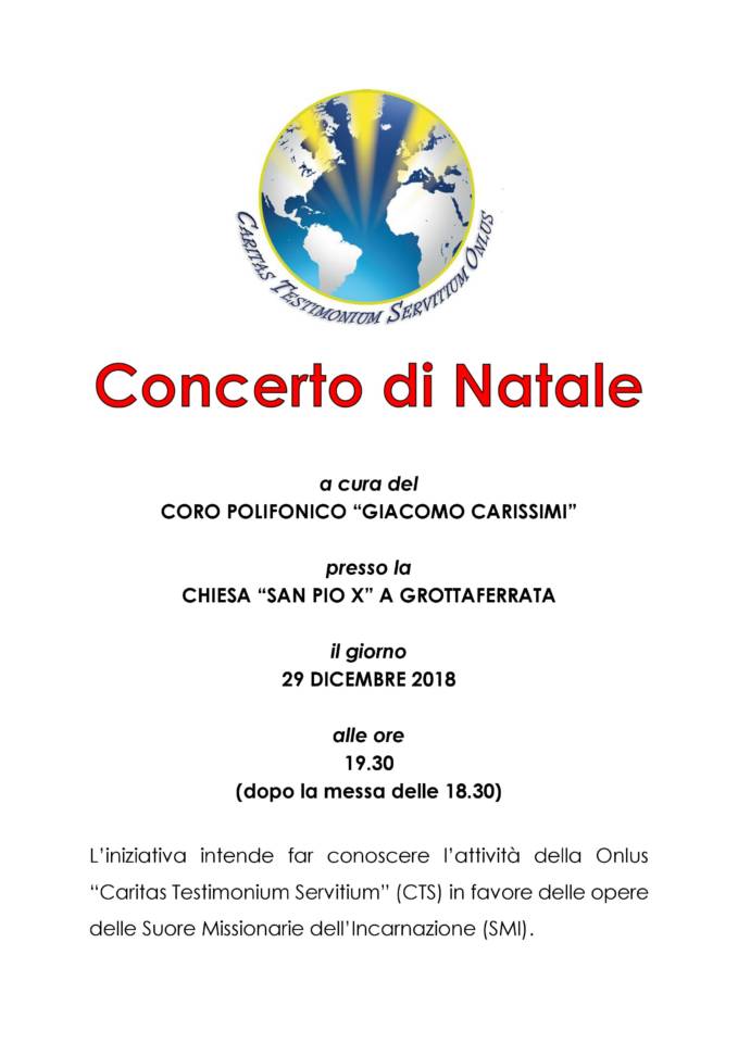 La Onlus “Caritas Testimonium Servitium” (C.T.S.) è lieta di invitarti al consueto concerto di Natale, presso la chiesa “San Pio X” di Grottaferrata, il 29 dicembre 2018, alle ore 19.30 (subito dopo la messa delle 18.30).