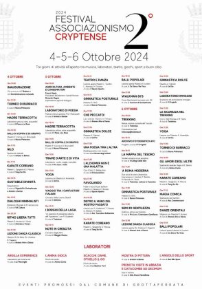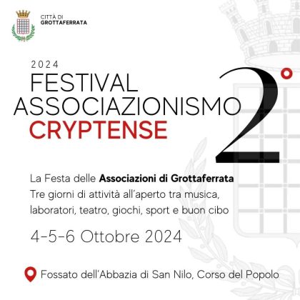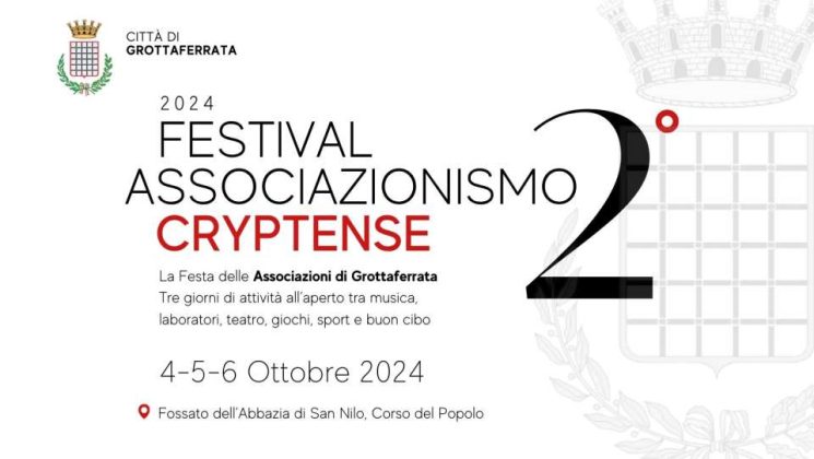 Il 4, il 5 e il 6 ottobre, il 2 ° Festival dell’Associazionismo Cryptense vedrà impegnate tutte le associazioni di Grottaferrata in un unico grande evento, pensato per conoscere da vicino il lavoro di centinaia di volontari e per passare fantastiche giornate all’insegna del divertimento, con concerti, spettacoli teatrali, balli, convegni, laboratori interattivi adatti a tutti, giochi per i più piccoli e moltissime altre attività culturali.