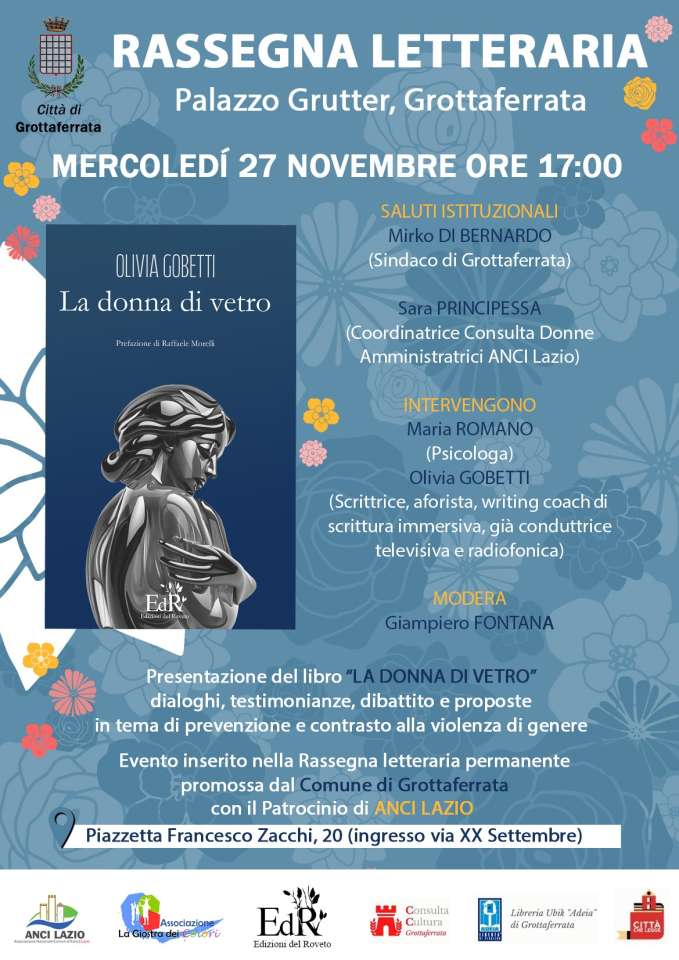 Mercoledì 27 novembre, con inizio alle 17:00, presso la Sala conferenze di Palazzo Grutter, a Grottaferrata, nell’ambito della Rassegna Letteraria promossa dall’Amministrazione comunale, verrà presentato il libro “La donna di vetro”, di Olivia Gobetti.