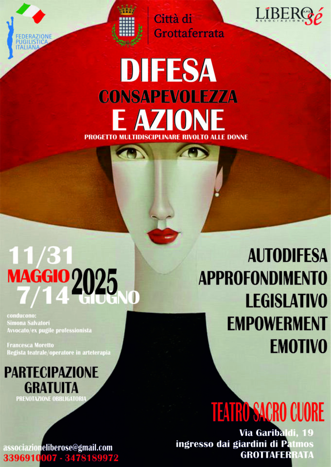 Al Teatro Sacro Cuore, sotto il patrocinio del Comune di Grottaferrata, parte il progetto “Difesa, consapevolezza e azione” dell’Associazione Libero Sé APS. Si tratta di un corso multidisciplinare contro la violenza di genere che, grazie al contributo straordinario concesso dal Comune, sarà completamente gratuito per tutte le donne che vorranno partecipare.