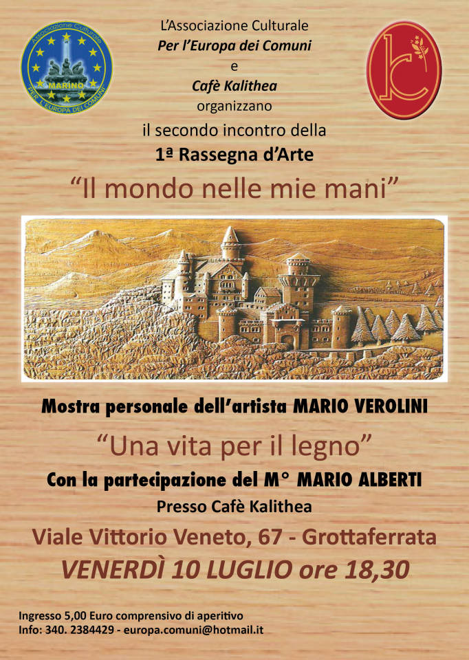 Il secondo incontro della 1a Edizione della Rassegna d’Arte “Il mondo nelle mie mani” promossa dall’ Associazione culturale marinese Per l’Europa dei Comuni in collaborazione con il Cafè Kalithea si svolgerà venerdì 10 luglio alle 18.30 presso Cafè Kalithea in Viale Vittorio Veneto 67 a Grottaferrata (RM). La kermesse si aprirà con la mostra personale dell’artista Mario Verolini dal titolo Una vita per il legno. Con la partecipazione del M° Mario Alberti.