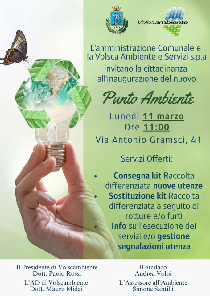 Lunedì 11 Marzo alle ore 11,00 verrà inaugurato a Lanuvio il nuovo Punto ambiente voluto dall’amministrazione comunale e dalla ditta Volsca Ambiente e Servizi spa che gestisce il servizio di raccolta rifiuti nel comune.