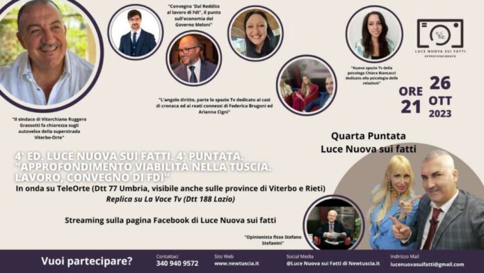 Scatta la quarta puntata ufficiale della quarta edizione di “Luce Nuova sui fatti”. Giovedì 26 ottobre alle 21, su TeleOrte (Dtt 77 Umbria, visibile anche nelle province di Viterbo e Rieti) e su La Voce Tv (Dtt 188 Lazio), ci sarà la quarta uscita del format di approfondimento della trasmissione televisiva più vista della provincia di Viterbo che va in onda in tutto il Lazio e l’Umbria ed è visibile online in tutta Italia.