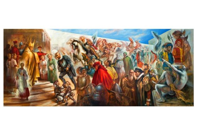 SESTA OPERA – COLONNA E ORSINI: ologramma di un sodalizio. In questo quadro emerge il tema del potere, rappresentata dalle due casate che, unendosi, sugellano e rafforzano i loro imperi. L’ologramma è l’elemento di unione tra reale e virtuale, filo conduttore dell’intero progetto. Oltre ai protagonisti Marcantonio e la sua futura sposa Felice Orsini, spicca l’elemento spirituale, raffigurato dal volo di angeli che benedicono l’unione dei due personaggi ma che simboleggiano anche il mistero, l’imprevisto, il pericolo raffigurato anche dalla figura scura che scende le scale, lontano dallo spazio idilliaco dell’ologramma. Felicità e dolore, sentimenti costanti della realtà umana