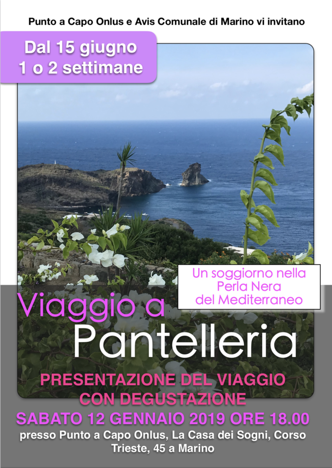 Punto a Capo Onlus e Avis Comunale di Marino nel presentare il viaggio a Pantelleria, illustreranno l’isola con immagini e degustazione di prodotti tipici, con la partecipazione di Marina Cozzo de Il Giornale di Pantelleria, di Peppe D’Aietti, storico, studioso, scrittore, editore e profondo conoscitore della Perla Nera e il saluto del Sindaco di Pantelleria, Vincenzo Campo
