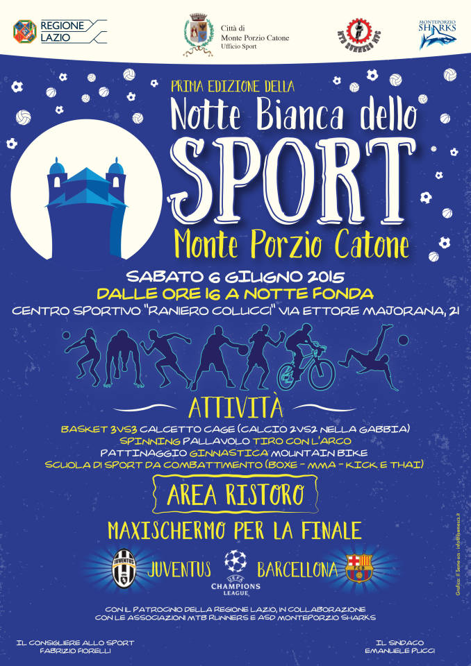 Sabato 6 giugno 2015, presso il Centro Sportivo “Raniero Colucci” di via Ettore Majorana, 21, si svolgerà la prima edizione della “Notte Bianca dello Sport Monte Porzio Catone”, evento promosso dal Comune di Monte Porrzio Catone, tramite il Consigliere delegato allo Sport, Fabrizio Fiorelli che in questo modo ne spiega le motivazioni: «questo evento parte dal desiderio di promuovere una sana cultura sportiva, facendo nascere un interesse che spinga i più e meno giovani ad avvicinarsi in modo costante alle attività sportive; lo sport non può essere ridotto solo ad un momento ricreativo ma deve essere uno strumento educativo e formativo capace di favorire l’aggregazione di diverse realtà sociali dove crescere e divertirsi in modo sano».