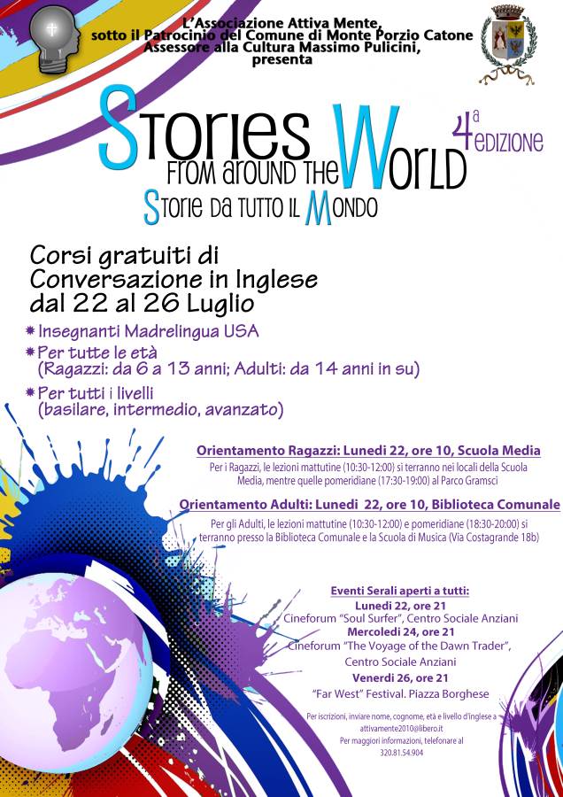 Dal 22 al 26 luglio 2013 con “Stories from around the Word” IVᵃ Edizione, a Monte Porzio Catone, si svolgeranno i corsi gratuiti di conversazione in inglese con insegnanti madrelingua USA, per tutte le età e per tutti i livelli.