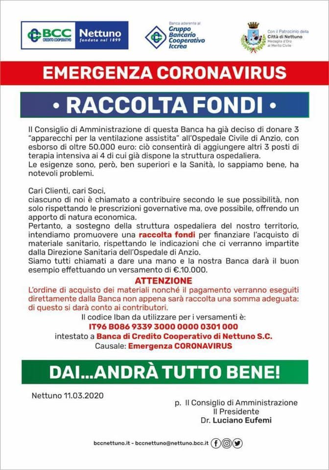 La BCC di Nettuno con il Patrocinio del Comune ha lanciato una raccolta fondi per l’emergenza Coronavirus. La Banca ha già deciso di donare tre apparecchi di ventilazione assistita all’Ospedale di Anzio a cui si aggiunge questa iniziativa con la quale ognuno di noi potrà fare la sua parte nella battaglia contro il Covid – 19. Di seguito tutte le indicazioni per effettuare una donazione 👇