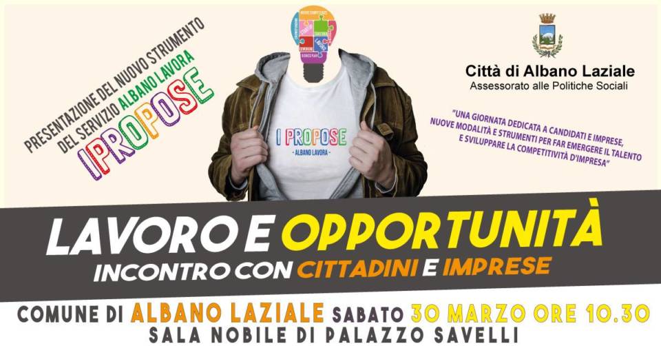 Sabato 30 marzo alle ore 10.30 presso la Sala Nobile di Palazzo Savelli (Piazza Costituente, 1 – Albano Laziale), si terrà un nuovo appuntamento promosso dallo sportello Albano Lavora, a cura dell’Assessorato alle Politiche Sociali e del Lavoro del Comune di Albano Laziale. Sarà presentato “IPropose”, un nuovo strumento utile a favorire l’incontro fra domanda ed offerta di lavoro in maniera innovativa. A Palazzo Savelli si terrà una vera e propria giornata dedicata interamente a candidati e imprese, alle nuove modalità e strumenti per far emergere la propria vocazione e a come sviluppare la competitività d’impresa. Durante l’iniziativa saranno presenti aziende come Infojobs e Altea Federation che parleranno dei segreti della ricerca del personale e delle nuove figure professionali in ambito tecnologico.