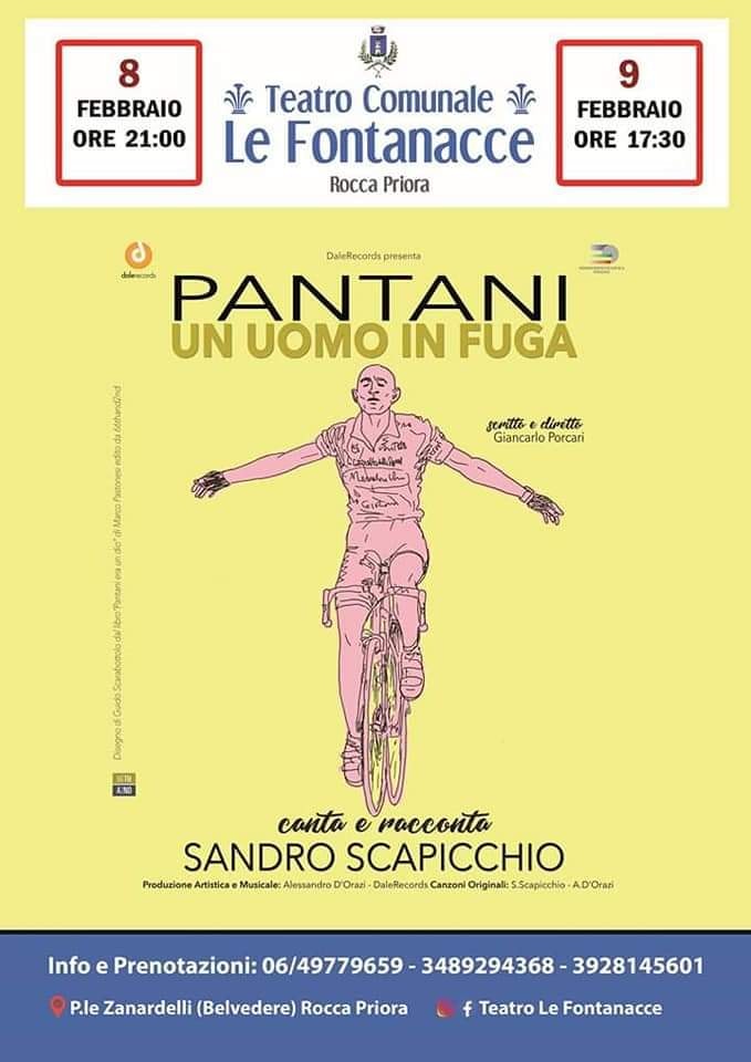 Sabato 8 Febbraio alle ore 21,00 e Domenica 9 Febbraio alle ore 17,30 al Teatro Comunale “Le Fontanacce” andrà in scena “Pantani. Un uomo in fuga”, scritto e diretto da Giancarlo Porcari, un grande spettacolo sulla vita del “Pirata” Marco Pantani raccontata da un suo grande amico Sandro Scapicchio. Sandro, canta e racconta una storia toccante di amicizia con un grande fuoriclasse dello sport, indimenticabile. Ma sarà solo il rumore assordante del vuoto e del silenzio a dargli la forza e il coraggio di ricordare. Canzoni, testi e musiche originali che coinvolgeranno lo spettatore in un arcobaleno di emozioni. Divertente, intelligente e mai banale. Per non dimenticare la storia di un “campione”, ma più di tutti di un uomo: MARCO PANTANI. E’ uno spettacolo adatto a tutti, sia a chi ha amato il grande pirata, emozionandosi con le sue epiche gesta, sia chi è appassionato di ciclismo, ma addirittura chi in vita sua non ha mai visto neanche una corsa ciclistica. Perché in realtà questa è la storia di una lunga amicizia nata tra due bambini che si incontrano per la prima volta sulla spiaggia di Cesenatico: uno diventerà il grande Campione e l’altro un musicista. Ma una sera decide di raccontare la sua amicizia con l’amico Marco, un racconto a posteriori quando l’epilogo della carriera di Pantani è già arrivato al traguardo amaro della sua vita e dei fatti che tutti noi conosciamo. La Storia non entra nei meandri giudiziari e non intende dare nessuna ulteriore sentenza, ma solo raccontare oltre le vittorie e le sconfitte del Ciclista, quelle parallele dell’uomo. La colonna sonora e le canzoni inedite dello spettacolo sono state scritte da Sandro Scapicchio e Alessandro D’Orazi. I direttori artistici del Teatro Comunale “Le Fontanacce” Luciana Frazzetto e Massimo Milazzo: dichiarano: “Siamo lieti di ospitare, fuori abbonamento, questo emozionante e coinvolgente monologo che ripercorre le tappe di Pantani come fosse una pellicola di un film.”