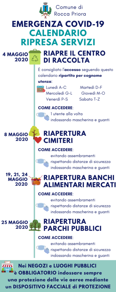 Con la riattivazione del Centro di Raccolta, sono sospesi dal 4 maggio i servizi di consegna a domicilio straordinari attivati nella prima fase di emergenza: consegna dei kit e ritiro sfalci a domicilio. Il calendario di consegna dei kit per la raccolta differenziata riprenderà nel mese di giugno. Martedì 19 maggio sarà al volta del Mercato della Terra in via Aldo Moro, seguito giovedì 21 maggio dalla riapertura del Mercato in piazza Nassirya e domenica 24 maggio dal Mercato Colle di Fuori. Nei tre mercati sarà possibile acquistare solo prodotti ortofrutticoli e generi alimentari e si dovrà accedere rispettando le seguenti misure: evitare la formazione di assembramenti; rispettare distanze di sicurezza interpersonale di almeno 1 metro; ogni cittadino dovrà indossare mascherina e guanti. Lunedì 25 maggio è invece prevista la riapertura dei parchi pubblici. Il calendario delle riaperture potrà subire delle modifiche in base anche alle future misure che verranno adottare a livello nazionale e/o regionale ed anche in base all’andamento della curva dei contagi. Per questo, il Comune, ricorda a tutti i cittadini che è importante mantenere le distanze e osservare tutte le misure in vigore: uscire da casa solo per necessità, lavoro o motivi di salute; indossare la mascherina nei luoghi pubblici al chiuso ed anche all’aperto, come previsto dalla Regione Lazio; mantenere le distanze con le altre persone di almeno un metro ed evitare gli assembramenti”. Lo rende noto l’Ufficio Stampa del Comune di Rocca Priora.