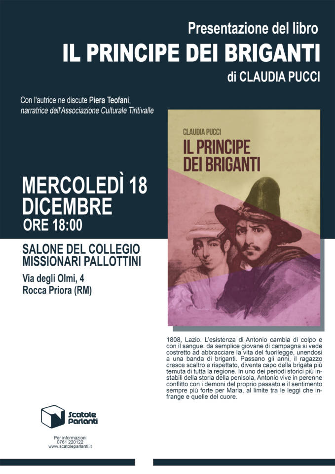 Mercoledì 18 alle 18 nel Salone dei Pallottini di Rocca Priora sarà presentato il romanzo storico: “Il Principe dei Briganti”, basato su vicende realmente accadute agli inizi dell’Ottocento nella zona dei Castelli Romani. A presentare il libro sarà l’autrice Claudia Pucci con Piera Teofani, narratrice dell’Associazione Culturale Tiritivalle. La storia, scritta da Claudia Pucci, è incentrata sulle azioni della “Banda della Faiola”, una delle più pericolose brigate di briganti mai esistite, operativa nelle impenetrabili foreste della Faiola e del Monte Maschio d’Ariano. Questo libro, frutto di approfondite ricerche presso l’archivio di stato, la biblioteca nazionale centrale di Roma e le biblioteche locali dei Castelli Romani, narra le vicende del brigante Gasperone, realmente esistito e vissuto agli inizi dell’800. Una storia dimenticata, eppure degna di essere ricordata e tramandata in quanto anche le storie locali hanno dignità di memoria, specie se bellissime storie. Al termine della presentazione a tutti i partecipanti verrà offerto un aperitivo in tema.