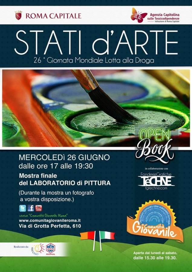 Mercoledì 26 giugno, in occasione della XXVI giornata di lotta alla droga, si è tenuto presso la Comunità Giovanile Roma di Via di Grotta Perfetta l’evento “Stati d’arte”, la mostra con cui si è concluso il corso di pittura durato quattro mesi, da febbraio a giugno, e in cui i partecipanti hanno esposto i loro lavori.