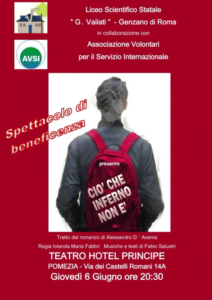 Giovedì 6 giugno, presso il teatro dell’Hotel Principe, via dei Castelli Romani, 14 A, Pomezia, andrà in scena lo spettacolo Ciò che inferno non è, realizzato dal laboratorio teatrale del Liceo Scientifico Giovanni Vailati di Genzano. Lo spettacolo è finalizzato ad una raccolta di beneficenza a favore dell’AVSI, in memoria di Yasmine Seffahi. L’ingresso è ad offerta libera.