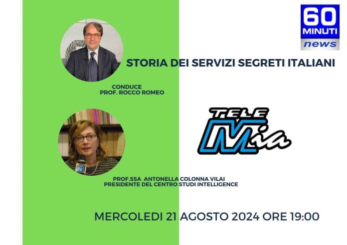 Mercoledì 21 agosto alle ore 19 si è tenuta una intervista del Prof. Rocco Romeo ad Antonella Colonna Vilasi sulla storia dei servizi segreti italiani sull’emittente televisiva Telemia, nella trasmissione “60 minuti news”.