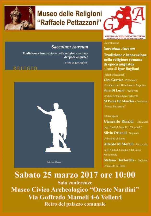 “Sabato 25 marzo, alle ore 10:00, presso la sala conferenze del Museo Civico Archeologico “Oreste Nardini” di Velletri, saranno presentati alla città gli Atti del Convegno “Saeculum Aureum. Tradizione e innovazione nella religione romana di epoca augustea”, realizzato a Velletri nel 2014 in occasione del Bimillenario Augusteo – inizia così la nota firmata da Maria Paola De Marchis, Presidente della Fondazione “Museo delle Religioni Raffaele Pettazzoni”. Al termine della presentazione si terrà una visita all’area archeologica delle SS. Stimmate, recentemente musealizzata e sede del cosiddetto “tempio volsco” di Velletri. L’incontro – continua così la nota- è promosso dal GAV – Gruppo Archeologico Veliterno e dal Museo delle Religioni “Raffaele Pettazzoni”. In basso, potete trovare il programma completo e informazioni puntuali sui due volumi che compongono gli Atti. In occasione della presentazione, sarà possibile acquistare i volumi a prezzo scontato – si conclude così la nota.
