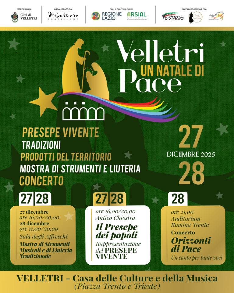 La Città di Velletri si prepara a vivere due giornate intense all’insegna della cultura, della tradizione e della spiritualità con l’evento “Velletri – Un Natale di Pace”, in programma il sabato 27 e domenica 28 dicembre presso la Casa delle Culture e della Musica, nel cuore del centro storico (Piazza Trento e Trieste). Proprio la cultura e la musica saranno i grandi protagonisti dell’iniziativa, promossa dal Comune di Velletri e organizzata dalla Fondazione De Cultura, con il contributo della Regione Lazio e di ARSIAL e la collaborazione delle associazioni O’ Stazzo, I Passi della Tradizione e Flauto Magico.