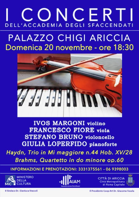 I Concerti dell’Accademia degli Sfaccendati al Palazzo Chigi di Ariccia sono realizzati dalla COOP ART di Roma (Socio AIAM) con il contributo del Ministero della Cultura e del Comune di Ariccia.