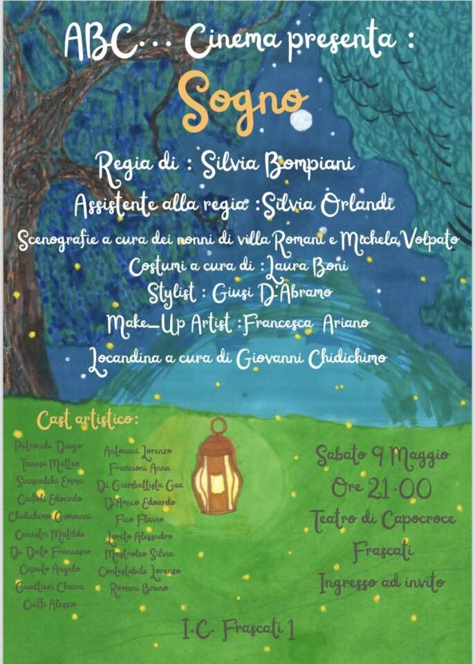 L’associazione ABC… Cinema, in collaborazione con l’I.C. Frascati 1, è lieta di presentare lo spettacolo teatrale *”Sogno”*, in programma sabato 9 maggio alle ore 21:00 presso il Teatro di Capocroce, a Frascati.