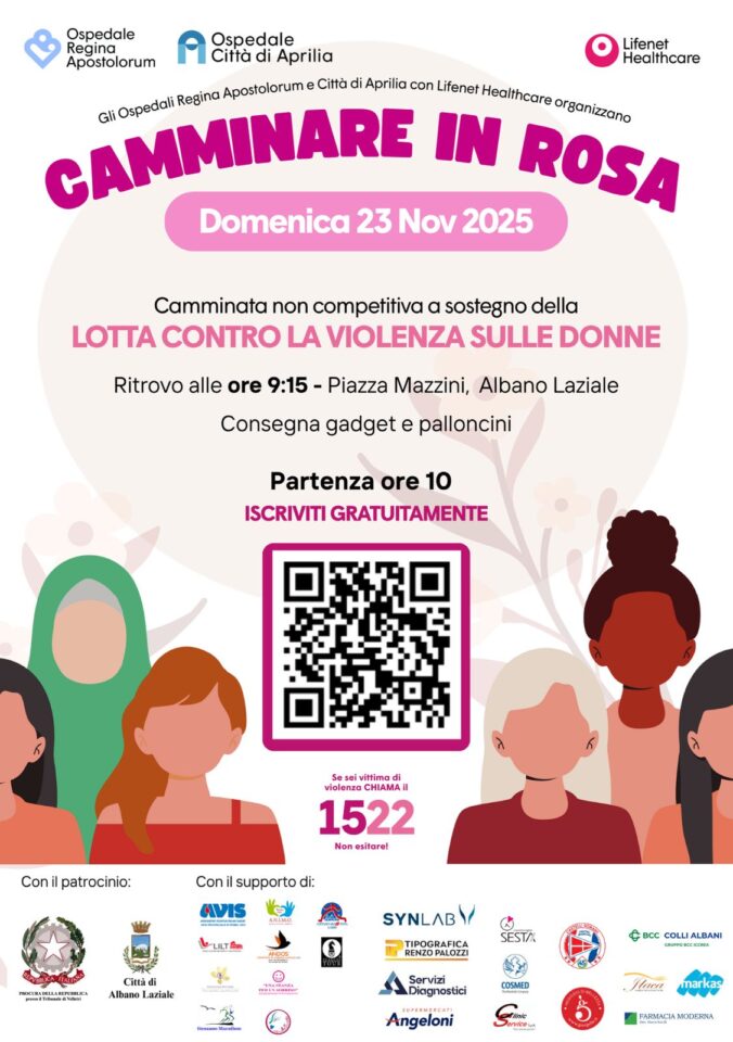 In occasione della Giornata internazionale per l’eliminazione della violenza contro le donne, a Albano Laziale l’Ospedale Regina Apostolorum invita cittadini e cittadine a unirsi alla camminata solidale “Camminare in Rosa”, che si terrà domenica 23 novembre con ritrovo alle 09:15 in Piazza Mazzini dove verranno consegnati Gadget ai partecipanti.