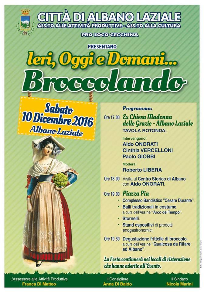 Gli Assessorati alle Attività Produttive e alla Cultura presentano “Ieri, oggi e domani… Broccolando”. L’appuntamento è per sabato 10 dicembre, a partire dalle 17, presso l’ex Chiesa Madonna delle Grazie, dove si terrà una tavola rotonda dedicata al broccolo, prodotto tipico albanense, alla quale parteciperanno il professor Aldo Onorati, la dottoressa Cinthia Vercelloni e l’agricoltore Paolo Giobbi. Modererà Roberto Libera. A seguire alle 18, Aldo Onorati condurrà una visita al centro storico, arrivando sino a piazza Pia dove, dalle 19, saranno posizionati stand espositivi enogastronomici con possibilità di degustazione di frittelle di broccolo a cura dell’Associazione “Qualcosa da Rifare ad Albano”. A fare da sfondo saranno alcuni brani eseguiti dal complesso bandistico “Cesare Durante”, balli tradizionali in costume a cura dell’associazione “Arco del Tempo” e stornelli.