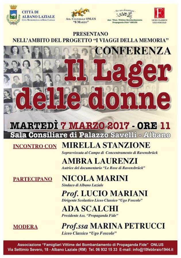 Martedì 7 marzo, alle ore 11, presso la Sala Nobile di Palazzo Savelli (piazza della Costituente n.1, Albano Laziale) si terrà la conferenza “Il Lager delle donne”, a cura delle associazioni “Familiari Vittime Bombardamento Propaganda Fide”, “8 marzo” e del Liceo Classico “Ugo Foscolo” con il patrocinio del Comune di Albano Laziale. L’iniziativa, inserita all’interno del progetto “I viaggi della memoria”, ospiterà, nel giorno che precede la Giornata Internazionale della Donna, la testimonianza di Mirella Stanzione, sopravvissuta al Campo di Concentramento di Ravensbruck. Interverrà anche Ambra Laurenzi, autrice del documentario “Le Rose di Ravensbruck”. Parteciperanno il Sindaco di Albano Laziale Nicola Marini, il Dirigente Scolastico del Liceo Classico “Ugo Foscolo” Lucio Mariani e la Presidente dell’associazione “Familiari Vittime Bombardamento Propaganda Fide”, Ada Scalchi. Modererà l’evento la Professoressa Marina Petrucci.