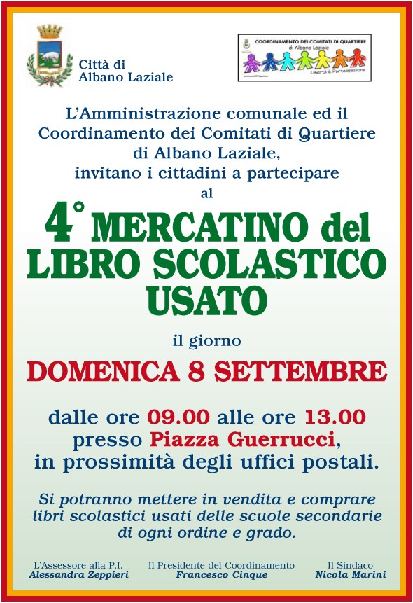 “Siamo giunti alla quarta edizione dell’appuntamento del mercatino del libro. Un evento che sottolinea l’importanza e l’attenzione che ha questa Amministrazione per le famiglie”, dichiara Alessandra Zeppieri, Assessore alla Pubblica Istruzione del Comune di Albano Laziale. “Il mercatino è un’occasione per far socializzare i ragazzi, renderli autonomi e permettere alle famiglie di risparmiare. Ringrazio per l’organizzazione il coordinamento dei Comitati di Quartiere”, conclude la Zeppieri.