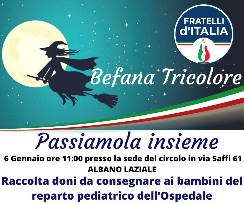 Il coordinatore di Fdi di Albano Cuccioletta annuncia l'appuntamento con la Befana Tricolore alle 11 del 6 gennaio presso la sede del Circolo di via Saffi 61